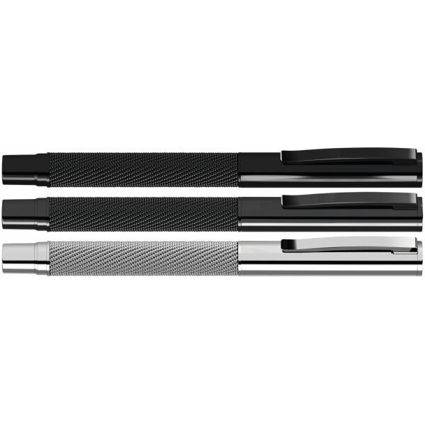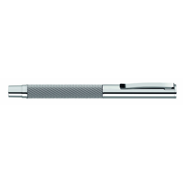 Metal rollerball in glossy lacquered finish with spring-mounted metal clip and barrel with integrated mesh band.